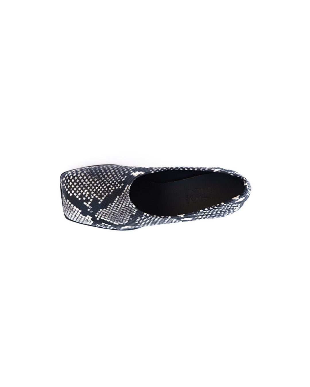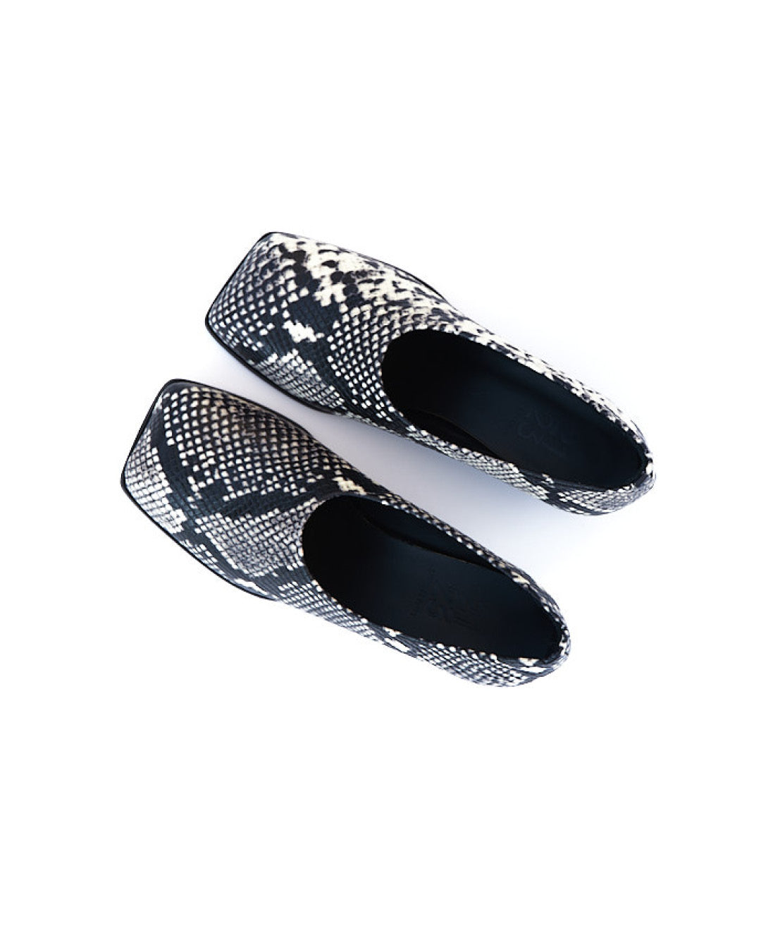 Realizzata in pelle di vitello con stampa pitonata – non vera pelle di serpente – interpreta la texture rettile in chiave etica, moderna e raffinata.