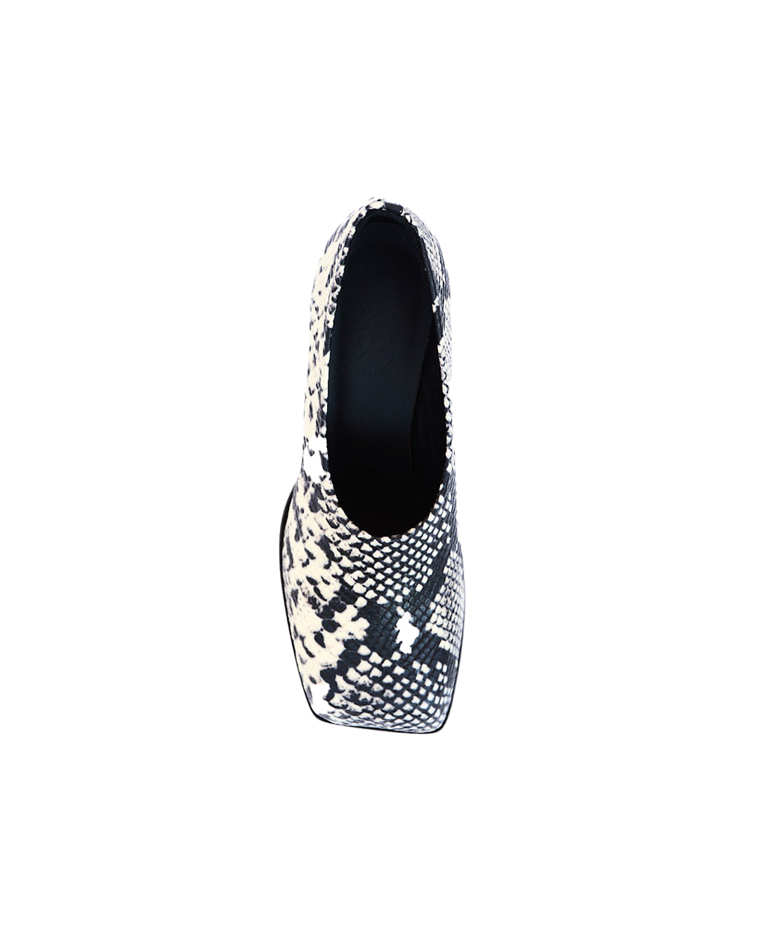 La punta squadrata e il tacco rocchetto asimmetrico laccato nero da 5 cm creano una silhouette scultorea, dove luce e movimento si incontrano in un equilibrio potente.