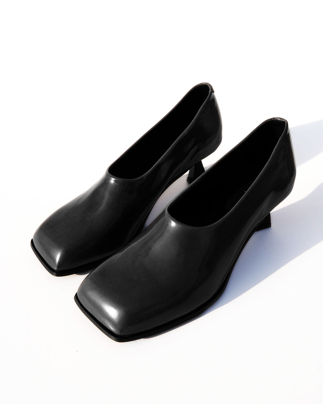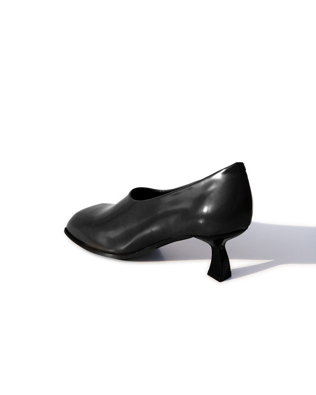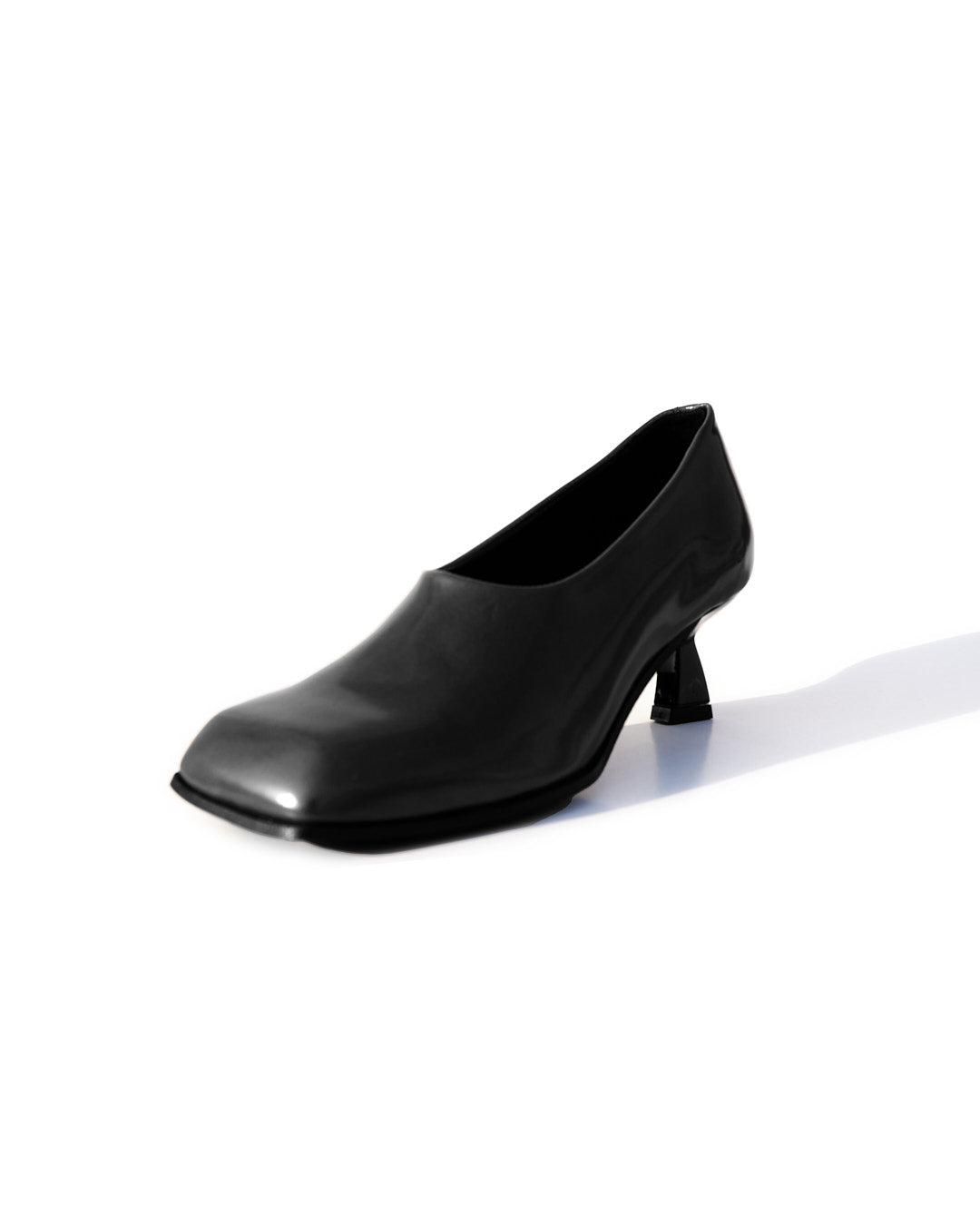 La punta fortemente squadrata incontra un tacco rocchetto asimmetrico, laccato in vernice nera, creando un contrasto tra rigore e fluidità.
