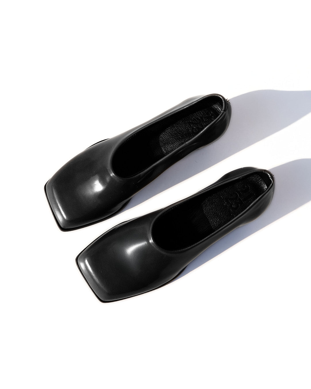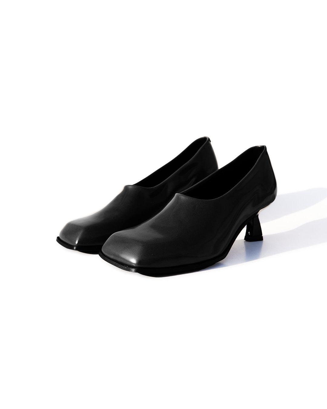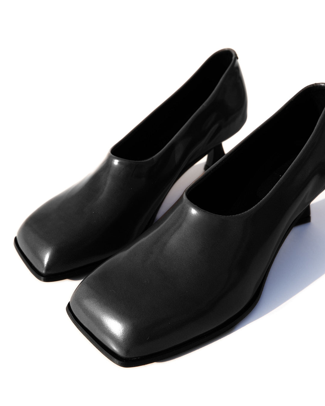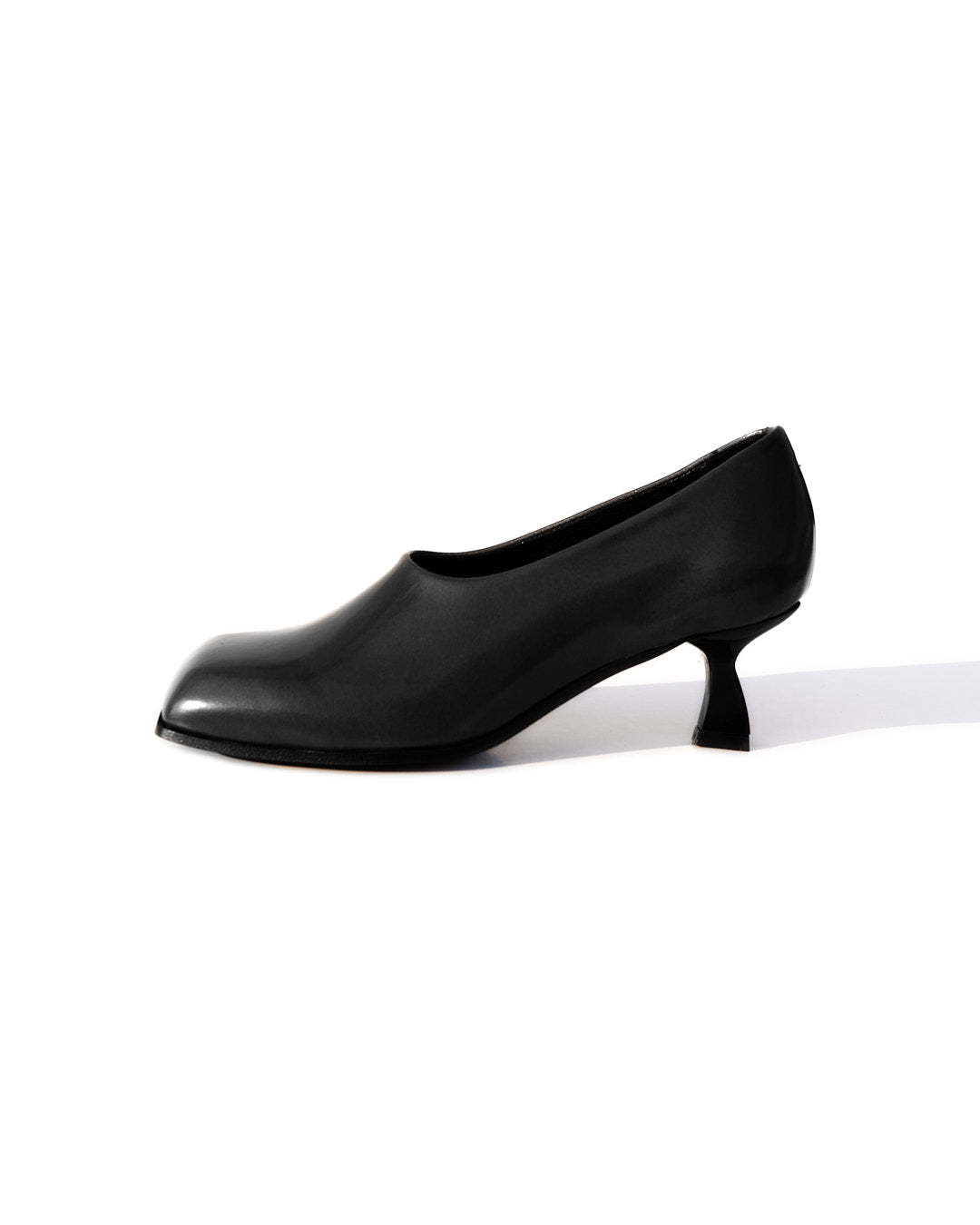 La punta fortemente squadrata incontra un tacco rocchetto asimmetrico, laccato in vernice nera, creando un contrasto tra rigore e fluidità.