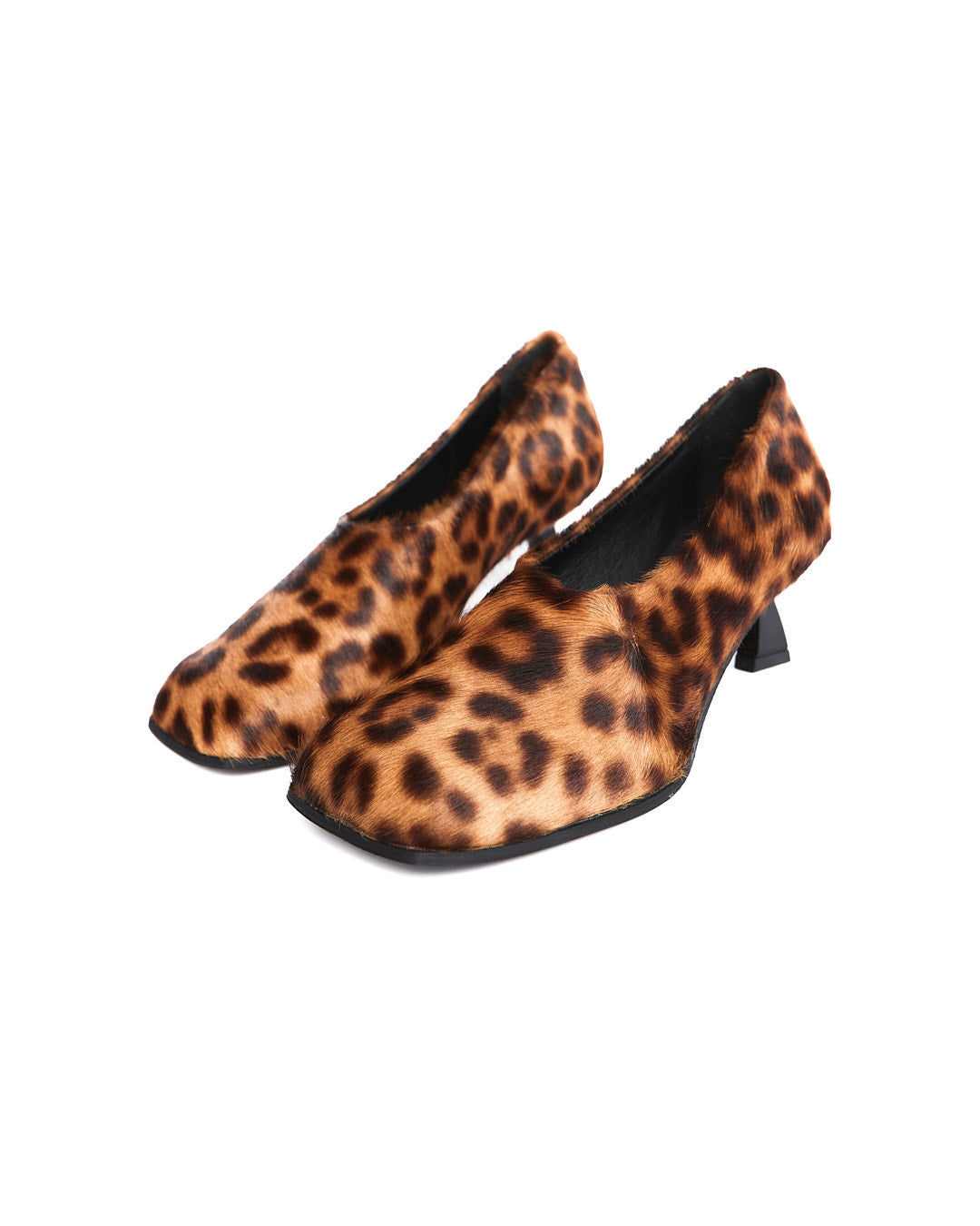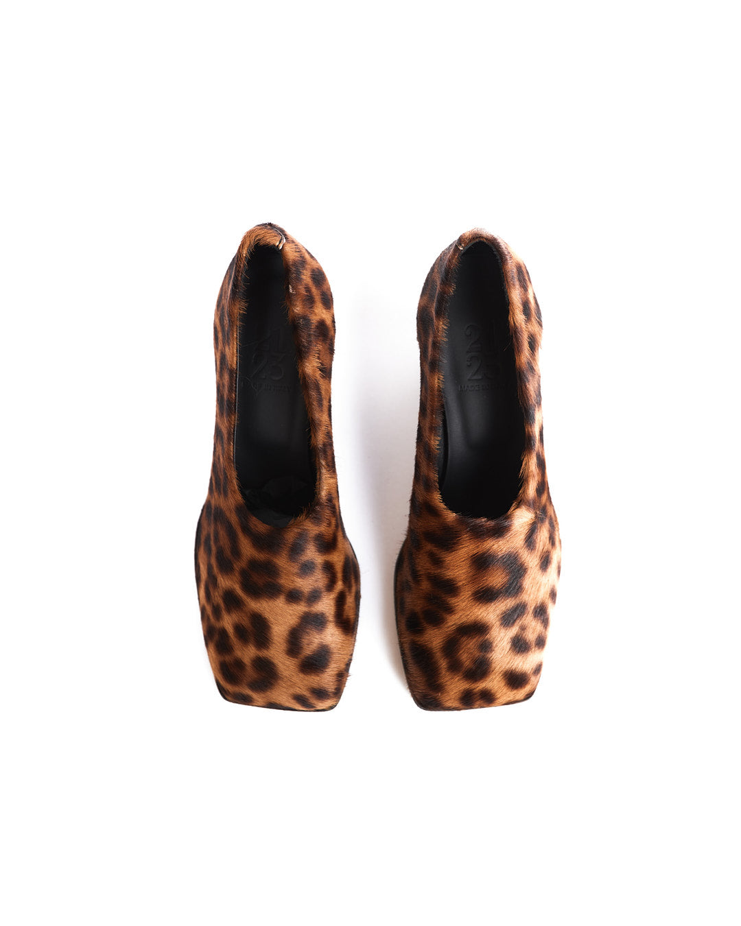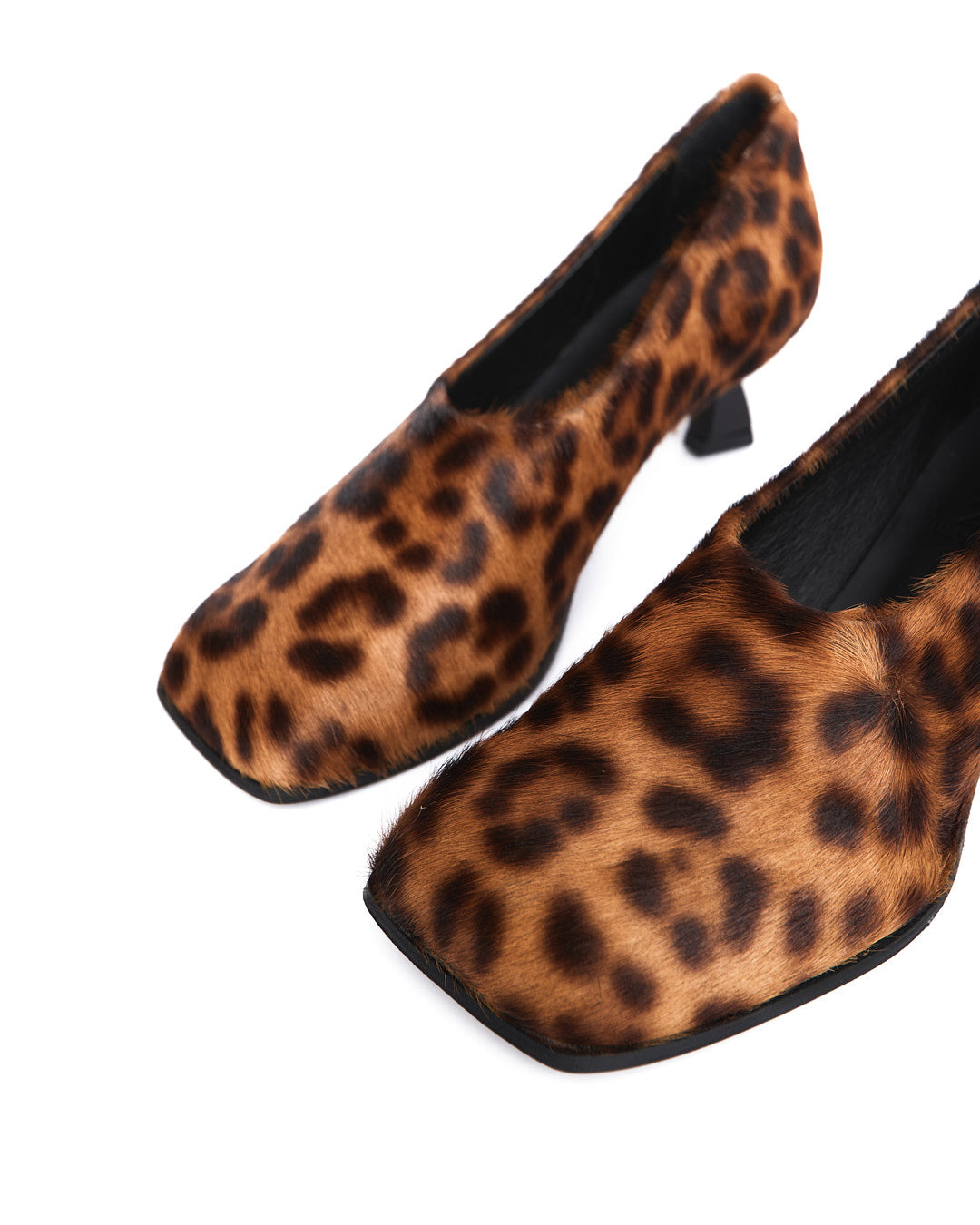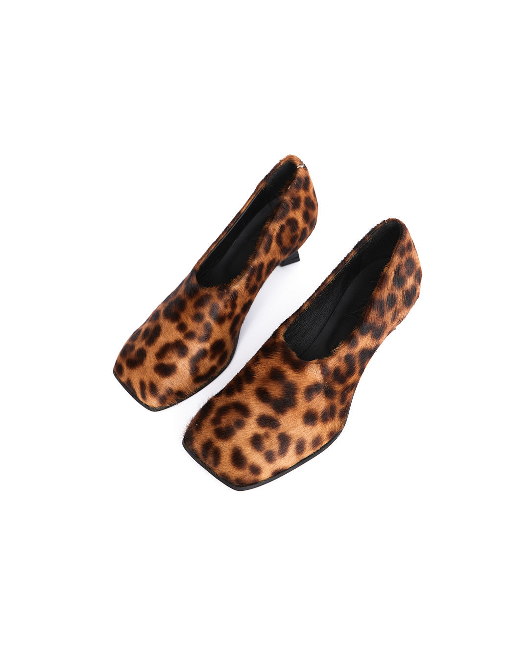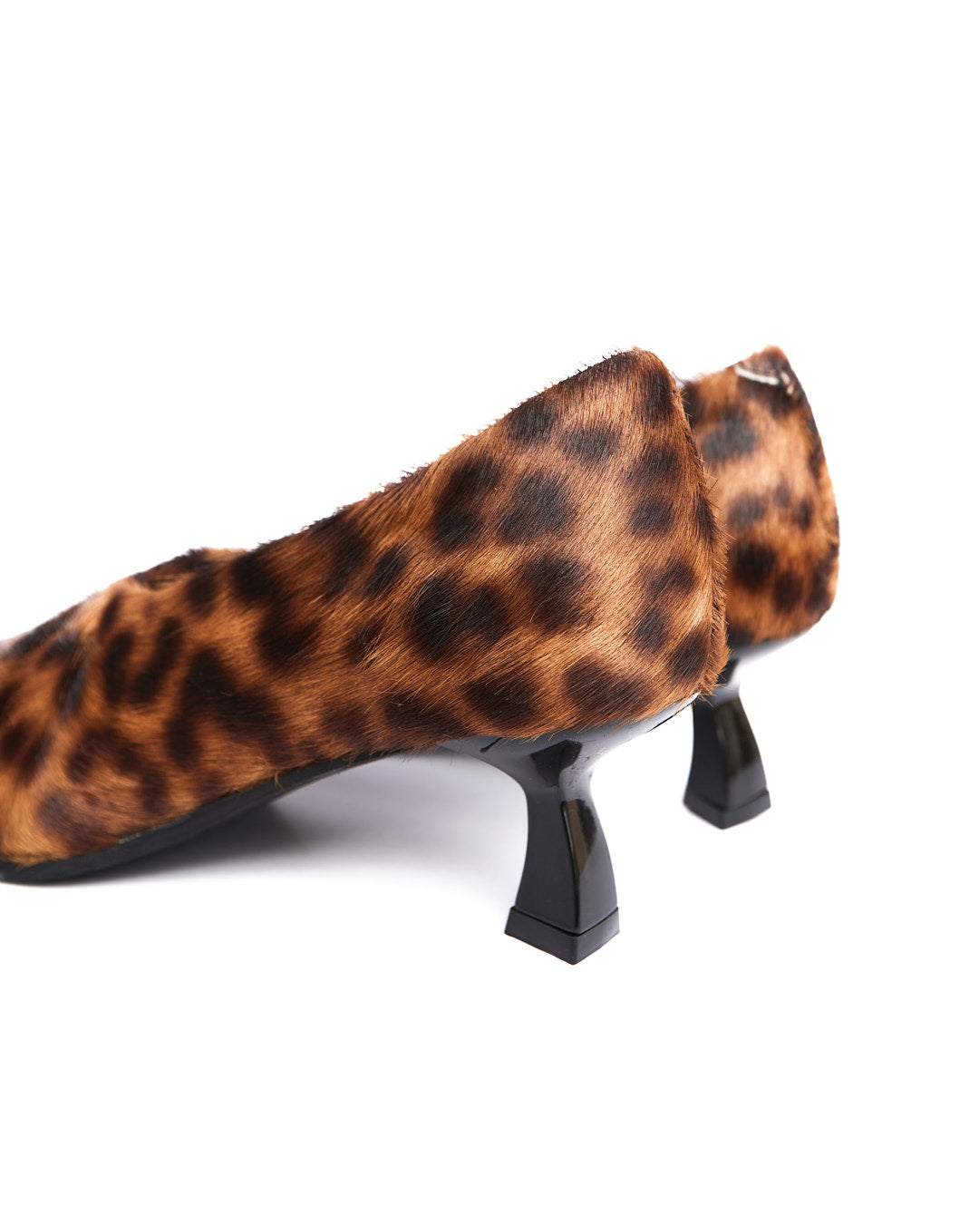 La punta squadrata e il tacco rocchetto asimmetrico mantengono l’identità scultorea del modello, mentre il pattern animalier si trasforma in gesto primordiale, elegante, audace.