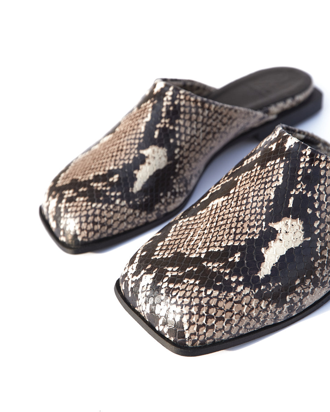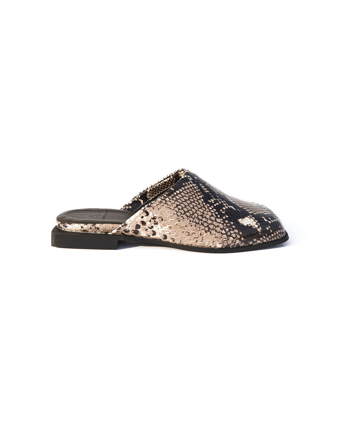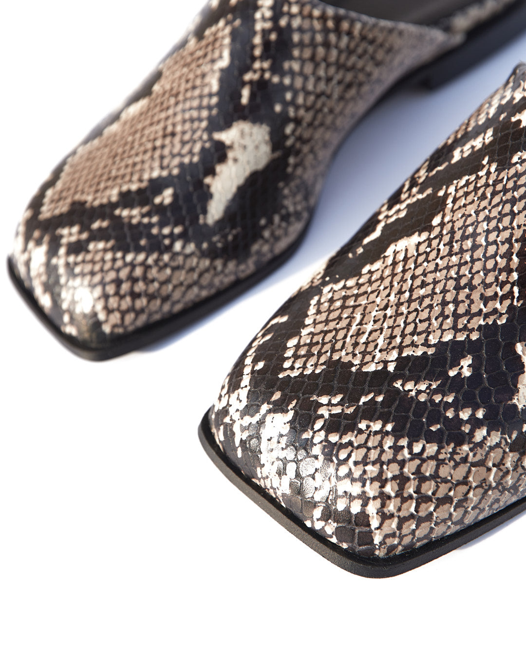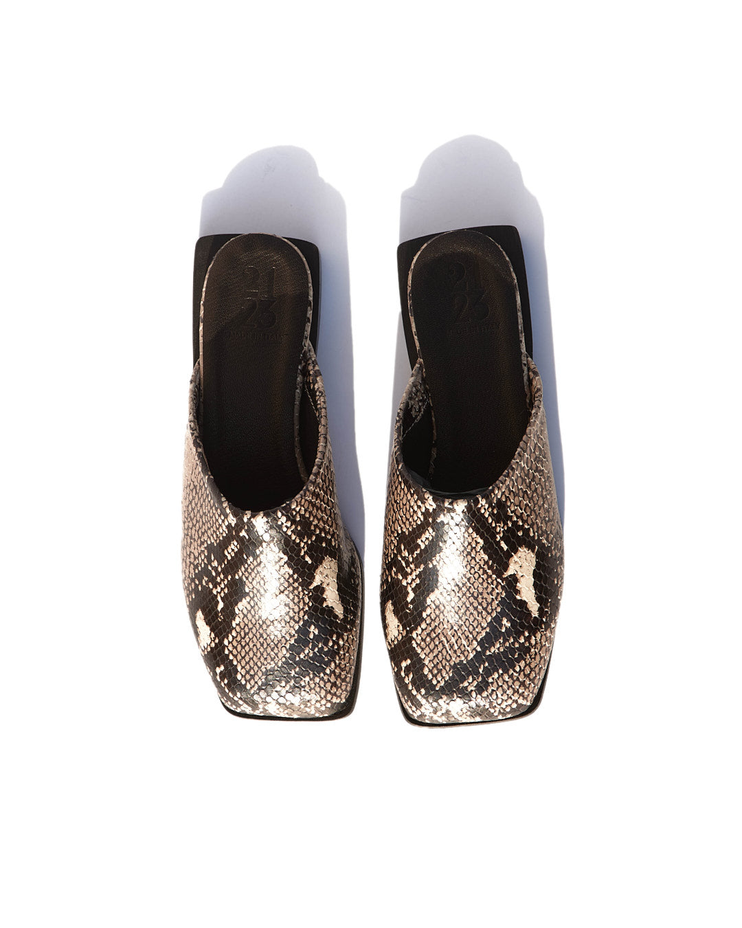 Realizzato in pelle di vitello con stampa pitonata, non vera pelle di serpente, nel pieno rispetto dell’etica 21.23.